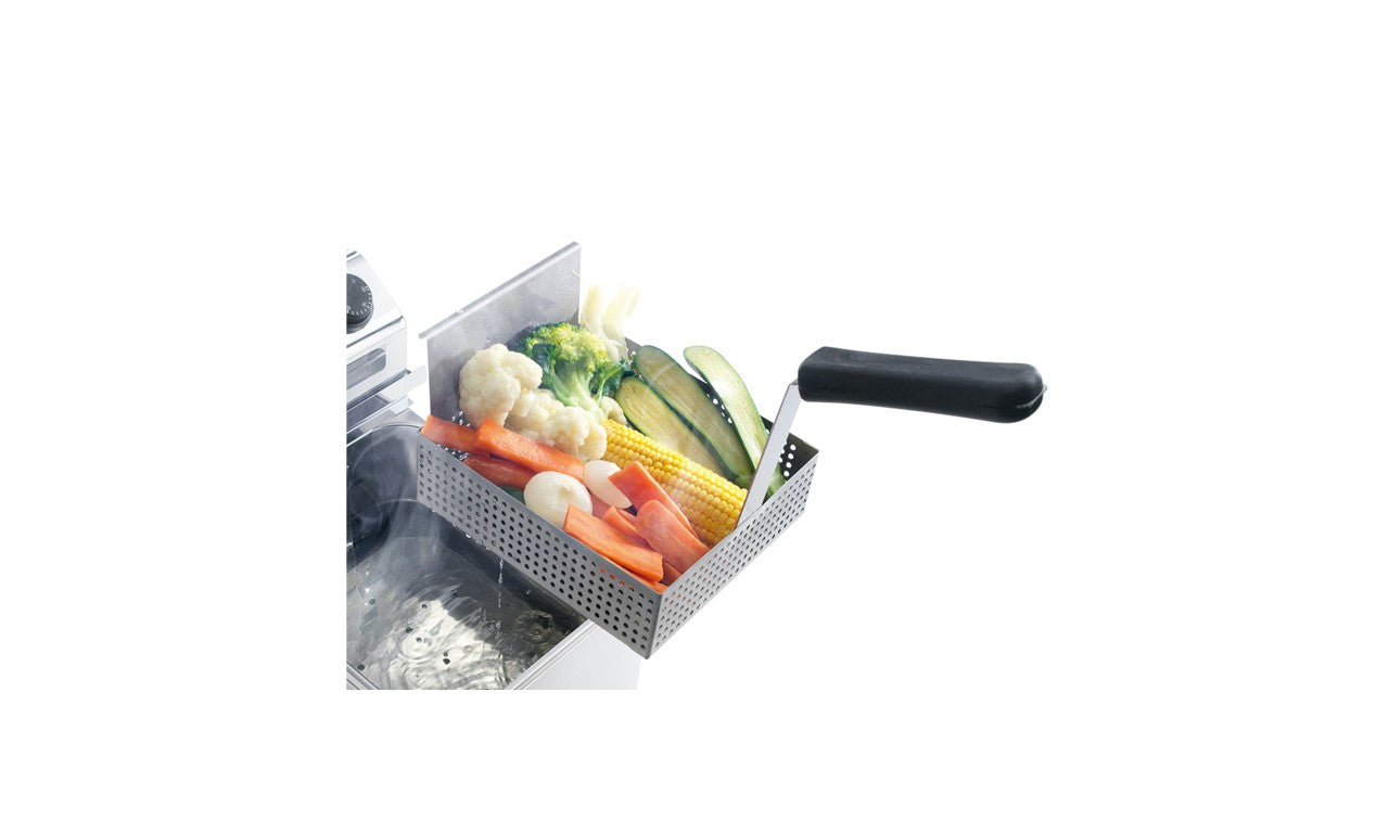 Konstrukcja i zbiornik wykonane ze stali nierdzewnej zapewniają nie tylko trwałość, ale także higieniczność urządzenia, co jest szczególnie istotne w branży spożywczej. Koszyk do gotowania makaronu również wykonany jest ze stali nierdzewnej, ma drobne oczka i poręczny uchwyt, co ułatwia jego użytkowanie i umożliwia łatwe odcedzanie gotowanego makaronu.