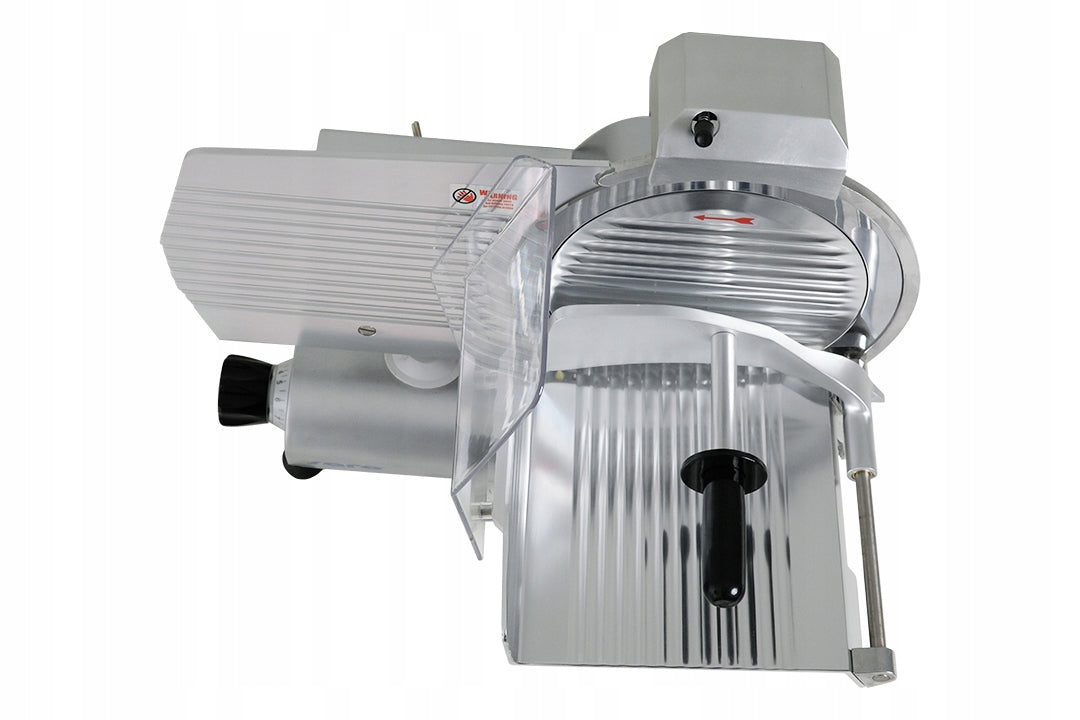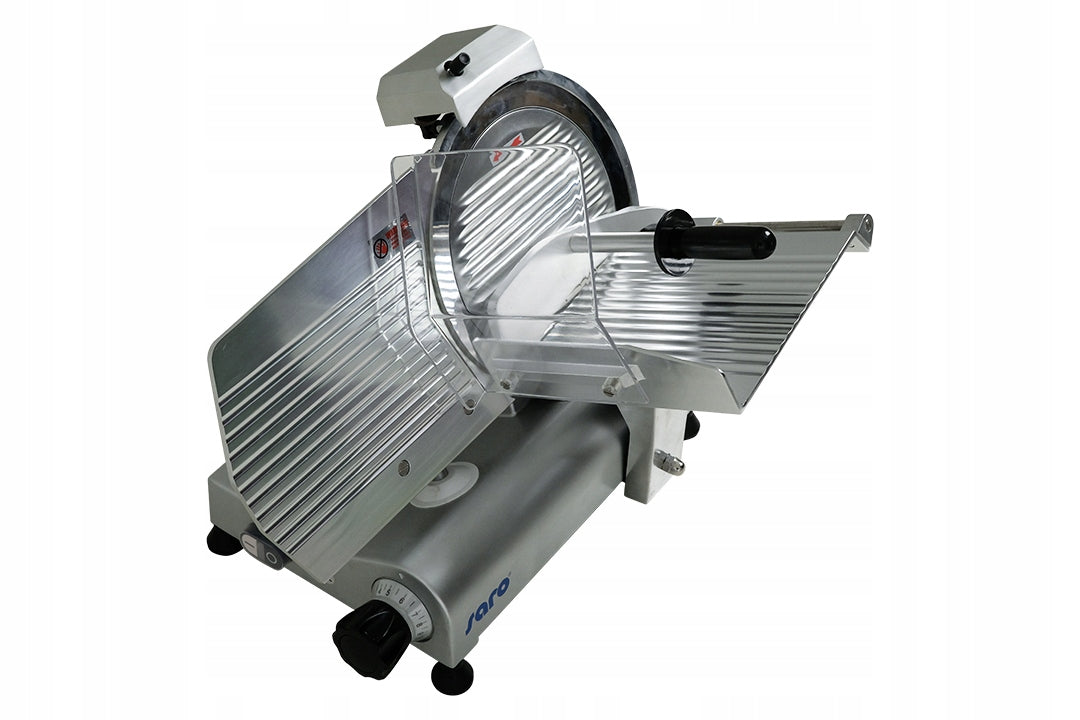 Krajalnica do wędlin z obudową z aluminium i ostrzem o średnicy 300 mm z wzmocnionej, chromowanej stali nierdzewnej. Nóż napędzany jest silnikiem 150 W, a grubość krojenia można regulować w zakresie od 0 do 13 mm. Ostrość zapewniona jest dzięki wbudowanej ostrzałce. Prowadnica krajalnicy została zamocowana na łożyskach kulkowych dla sprawnego i bezwysiłkowego użytkowania. Urządzenie nie zostało dostosowane do ciągłej pracy.