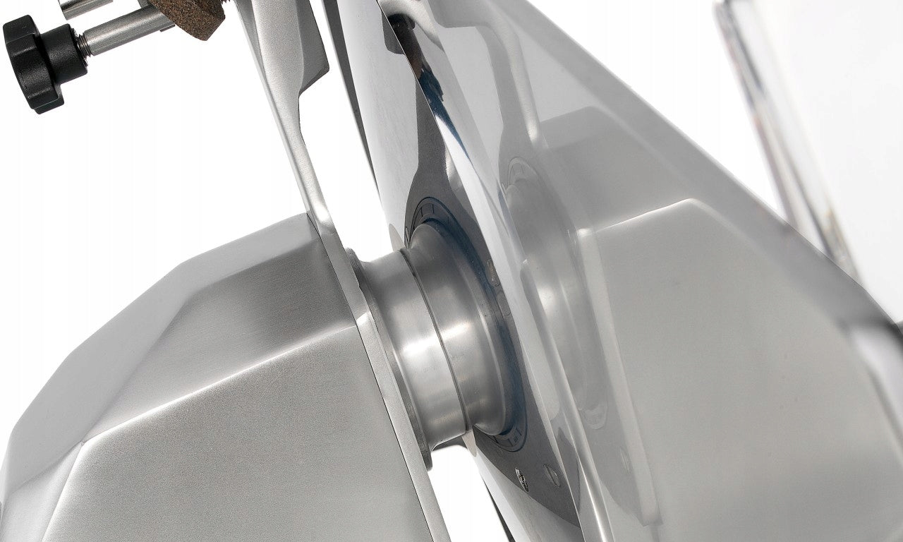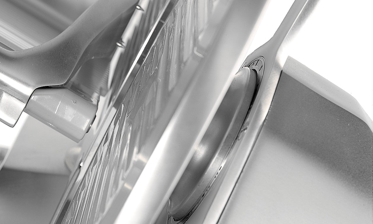 One of the main advantages of this slicer is the large gap between the blade and the motor, which makes it easier to clean and maintain proper hygiene. Additionally, the ventilated motor ensures reliable operation even with intensive use, which allows for continuous and efficient work. Forged and hardened blades of great thickness allow for precise cutting of various products, including hard and larger pieces of meat or cheese. The carriage sliding on self-lubricating bushings and overlapping pins ensures smooth movement during cutting, which translates into excellent cutting quality.