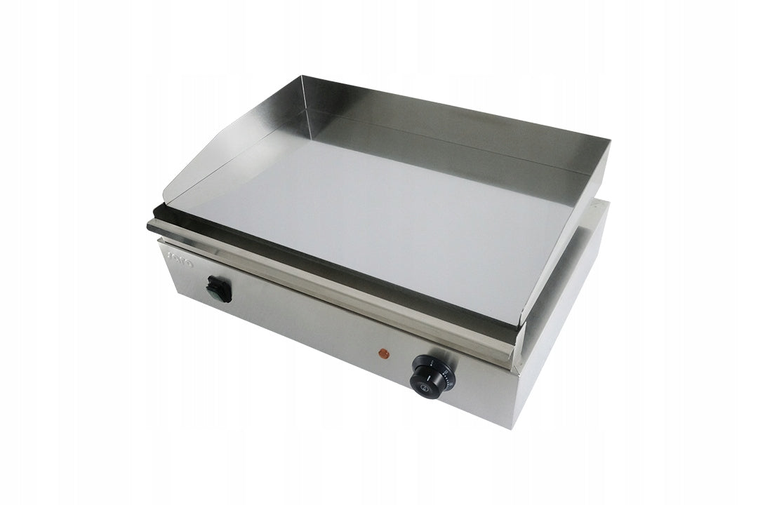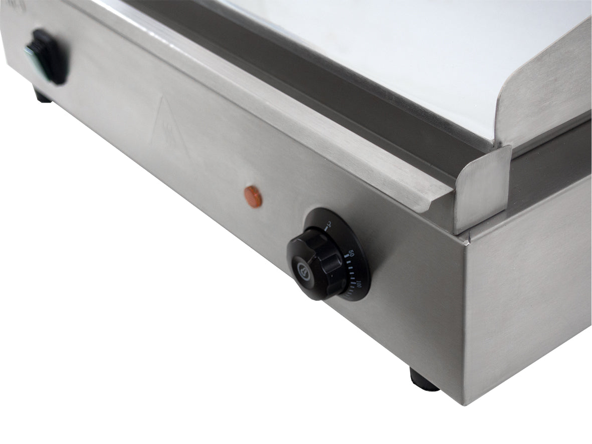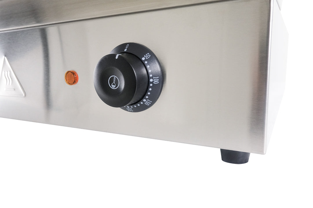 Electric grill plate made of stainless steel. The device has a chrome work surface, control knob, safety thermostat, on/off switch with light, fat drawer and rims. The temperature can be adjusted from 0 to 300 °C.