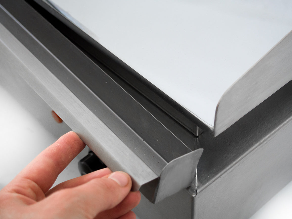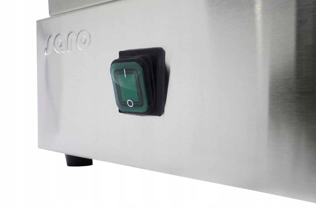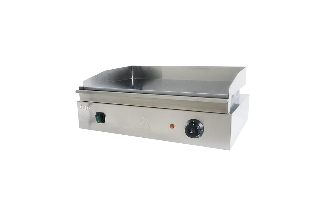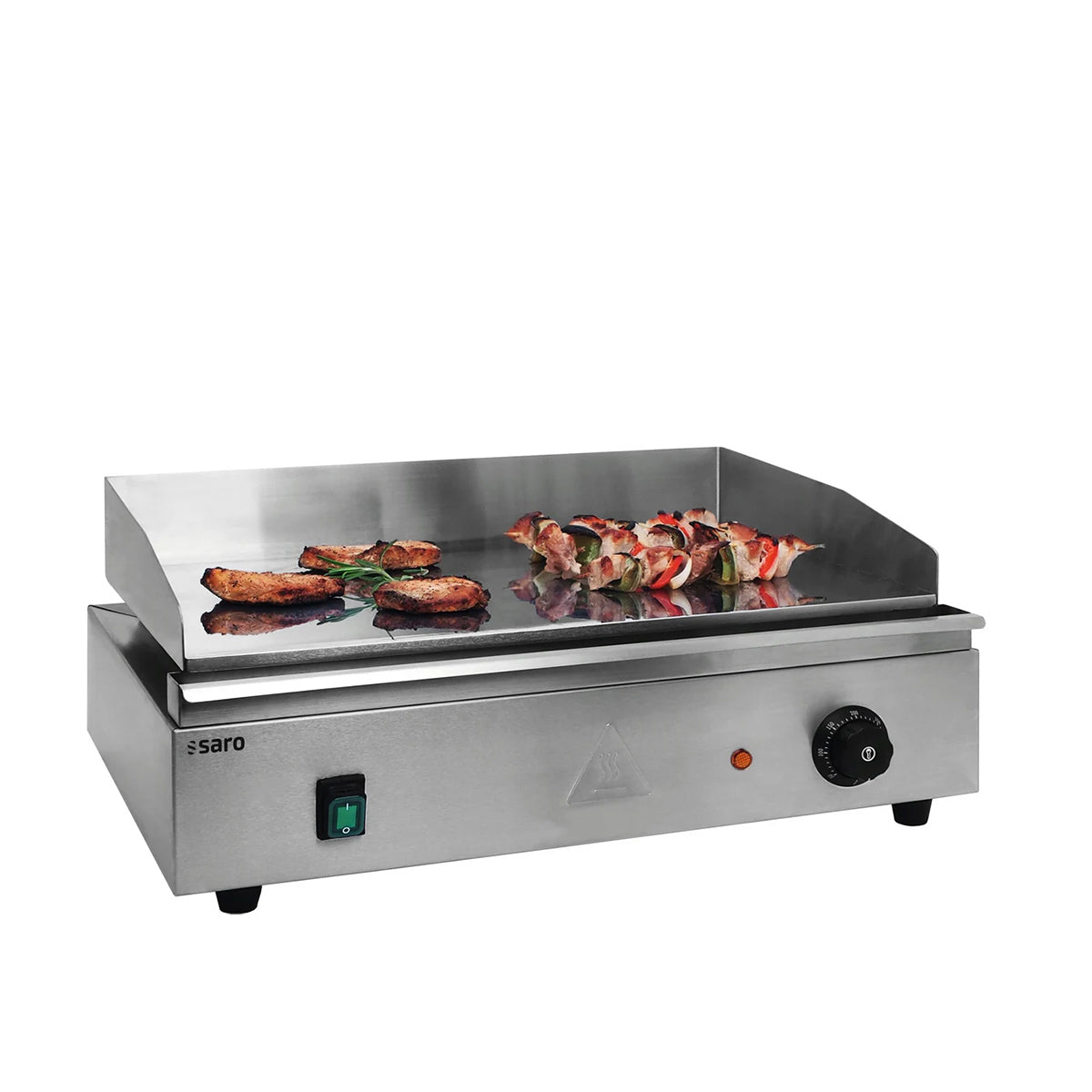 Electric grill plate made of stainless steel. The device has a chrome work surface, control knob, safety thermostat, on/off switch with light, fat drawer and rims. The temperature can be adjusted from 0 to 300 °C.